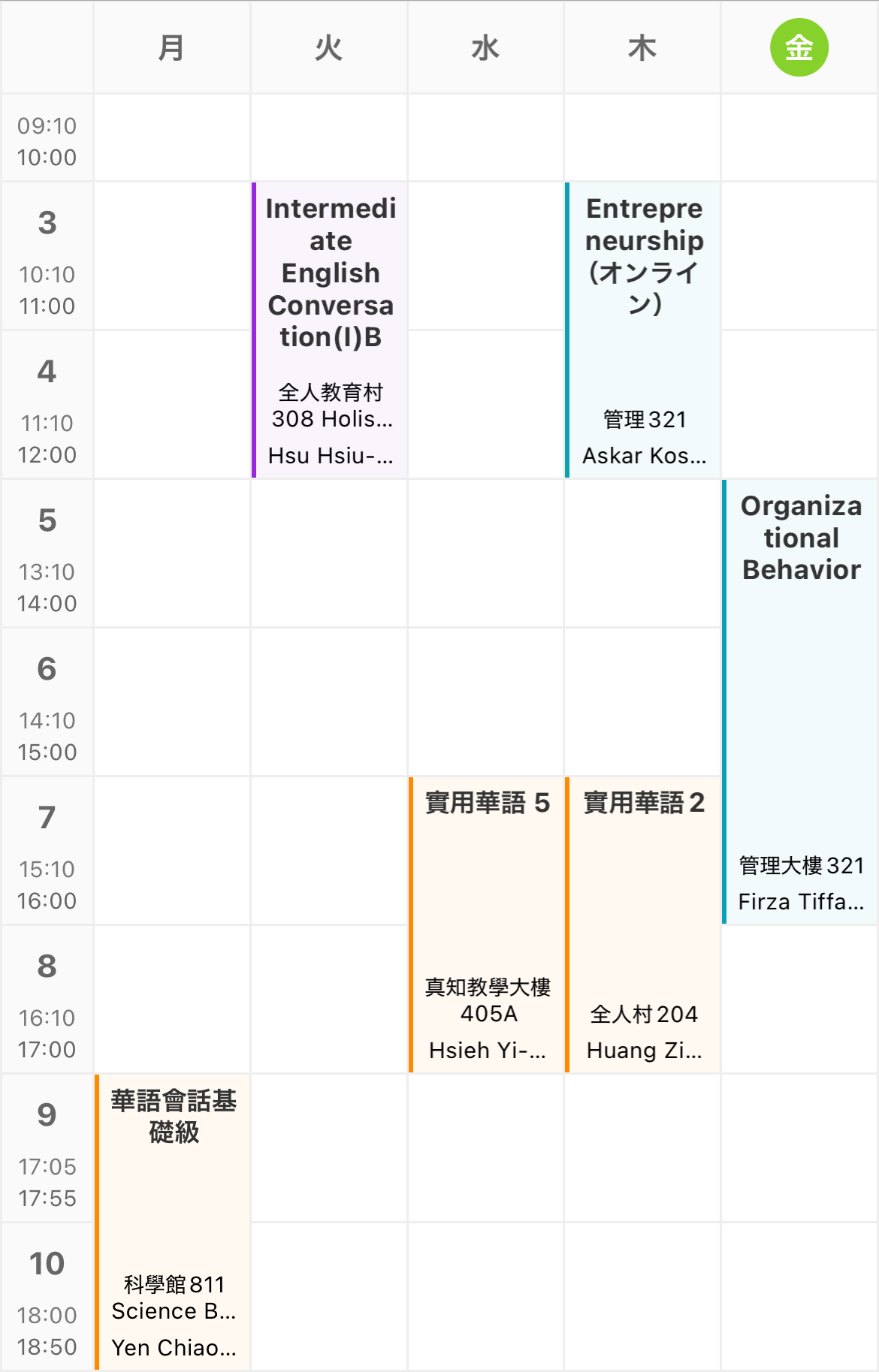 私は2年生の2学期で留学していて、帰国後ゼミの単位交換等を考える必要はないので、基本的に自分が興味のある授業で北九大で単位交換ができそうなものを選んで受講しています。私は現在留学生向けの中国語の授業を3つ、英語の授業を1つ、ビジネス(英語で開講)を2つ取っています。中国語の授業では、北九大で第二言語を取っていたときとは違い、先生は常に中国語で話しているのでとても勉強になるし、みんな優しくて面白い先生なのでとても楽しく中国語を学べています。英語の授業は単位交換のために取ったのですが、現地の英語学部の生徒と一緒に受講しており、グループディスカッションも多いので台湾の生徒と関われる良い機会になっています。授業によっては先生が中国語を話す英語の授業もありますが、私が受講しているものは英語のレベルが高めで英会話の授業ということもあり授業中先生はずっと英語で話すので特に問題なくできています。ビジネスの授業はどちらも中原大学のIUBMという学部の授業でここの生徒は各国からの留学生がほとんどなので中国語を話したり台湾人と関わることはないですが、いろんな国の人達の授業を受けられるのでいろんな国の話を聞けてとても興味深いです。