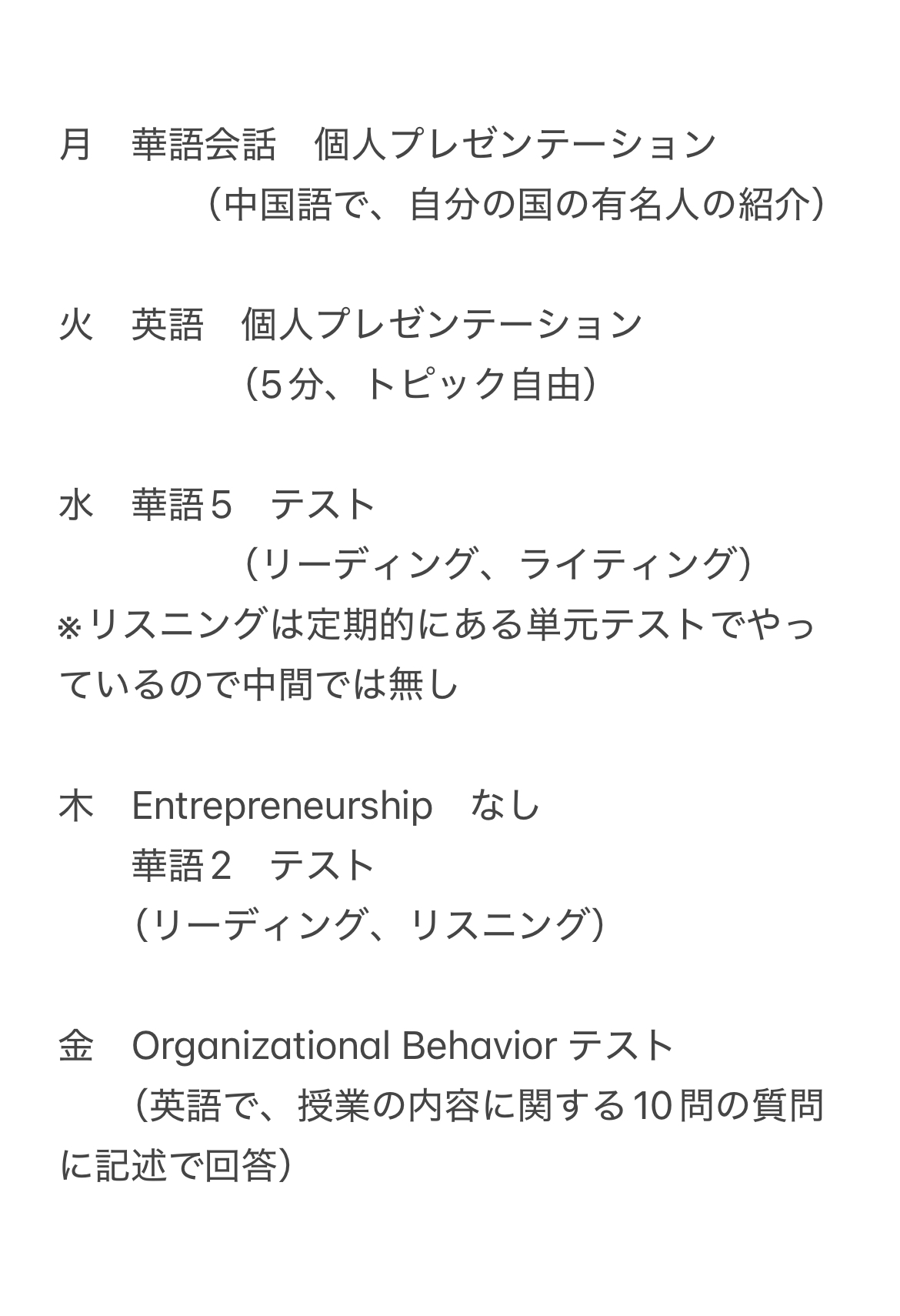 中原大学では11月頭に中間テスト、1月頭に期末テストの期間が各1週間あり、中間テストは既に終えたので何をしたかは写真にまとめてみました。中国語のテストは難しいこともありますが、先生も私が留学生ということは理解して少し低い点数を取ってしまっても日々の課題や授業態度から考慮してくれるので安心して受講できると思います。
