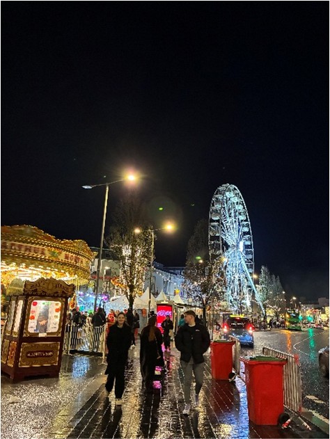 二つ目は、アイルランドのクリスマス文化です。アイルランドはキリスト教の国なだけあり、多くの人がクリスマスに対する熱意が違うなと思います。日本ではクリスマスを友人や恋人と過ごすことが多いと思いますが、アイルランドでは家族のための行事で、学生のほとんどが帰省し家族でお祝いをします。そのため、11月の中旬にはスチューデントクリスマスという、みんなが帰省してしまう前に学生同士でクリスマスを祝おうといった旨のイベントもあります。その日は、多くの学生がクリスマスジャンパーを着て、朝からパブで飲みます。疲れたら一度帰宅、その後また街に繰り出して飲むという流れです。さすがアイルランド、よく飲むなと思いました。また、ゴールウェイの街でも11月上旬頃からクリスマスマーケットが開かれていました。フードやドリンクの屋台はもちろん、観覧車やメリーゴーランドまで、小さい街ながらもかなり充実したもので、初めてのヨーロッパのクリスマスマーケットに感動したのを覚えています。しかしながら、このクリスマスマーケット、クリスマスイブの前日に終わってしまいます。先ほども述べたように、クリスマスは家族で過ごすための行事だからか、12月24,25日はすべての店が閉まります。それどころか公共交通機関も動きません。クリスマスパーティーのため友人宅へ行くのにUberTaxiを使うことになりました。