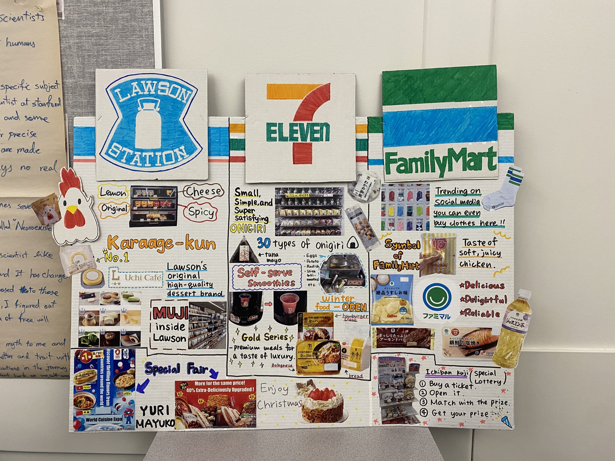 さて、12月に入ってすぐに、プレゼンテーションがありました。私は日本人のクラスメイトと日本のコンビニ紹介をしました。教室に自作のボードを設置して、他のクラスの人たちがローテーションで訪れる、ポスターセッション型のプレゼンでした。10分程度のプレゼンを連続して10ラウンド以上行ったのでとても疲れましたが、スピーキングの良い練習になり、達成感を感じました。